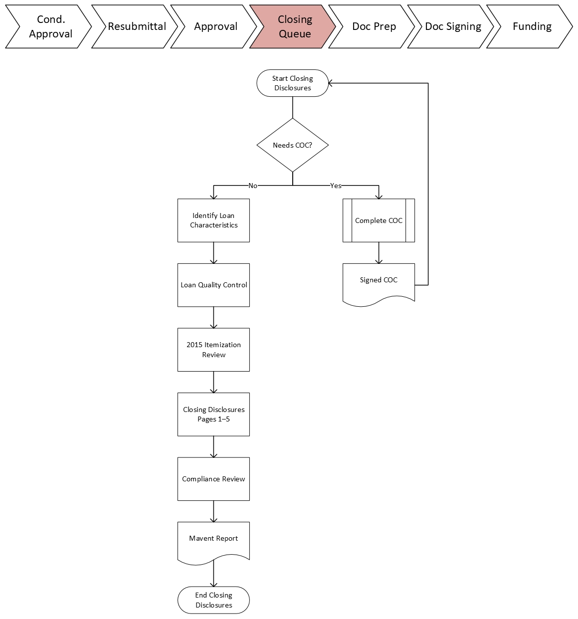 In the workflow above, we can also see that the Closing Disclosures specialist job begins with a question, and the answer to that question will determine whether the CD specialist will begin working on CD tasks, or whether a COC will need to be issued before restarting the workflow and moving on to CD tasks.