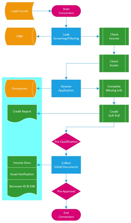 The workflow above represents the workflow of a Lead Manager (LM) or a Loan Officer Assistant (LOA) that works in lead conversion. The workflow is split into three columns, which we can define as (left to right):