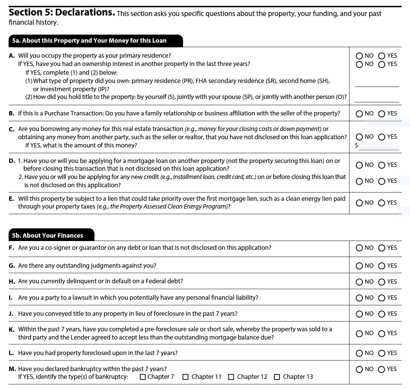 Section 5: Declarations asks the borrower to make a number of declarations about their financial situation and their understanding of the loan process.