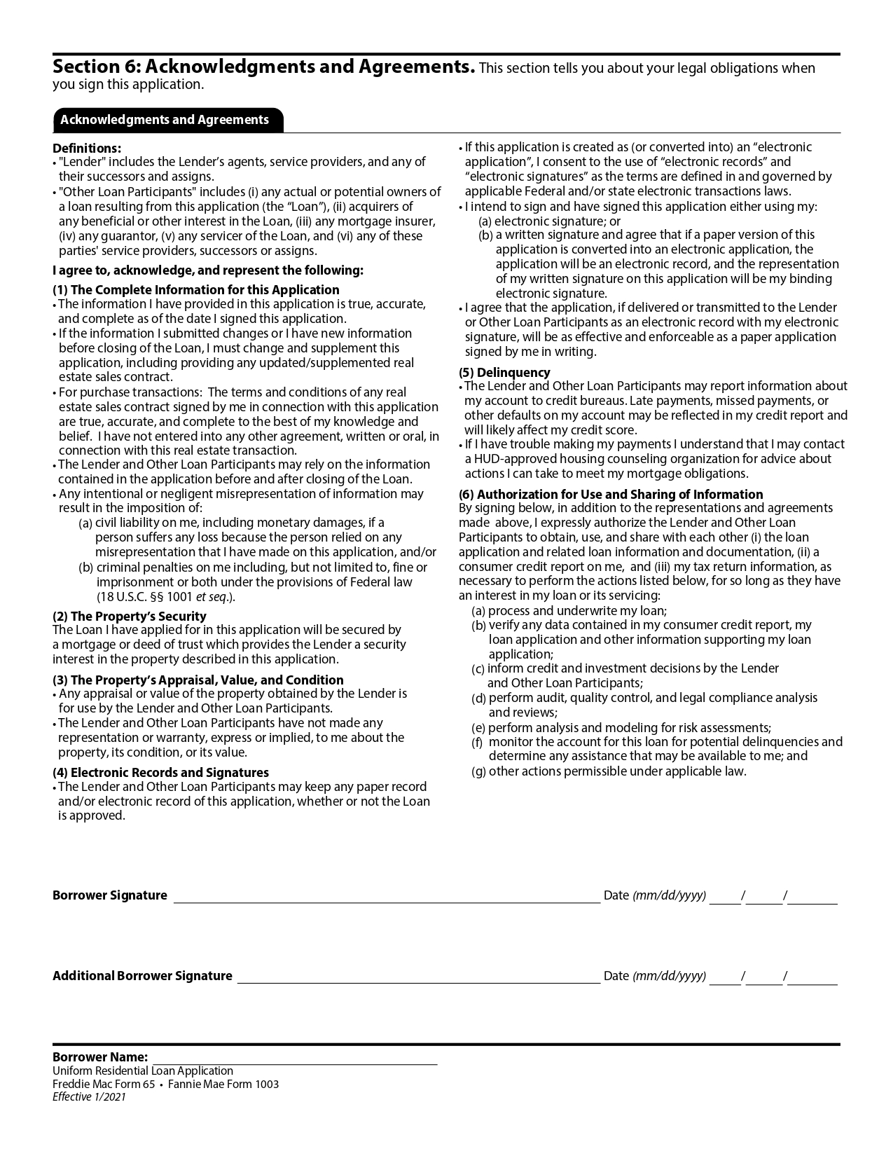 Section 6: Acknowledgements and Agreements asks the borrower to acknowledge and agree toa number of terms and conditions related to the loan, including: