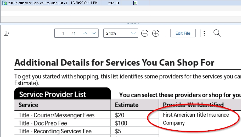 2015 Settlement Service Provider List – This company name/address should be different from our actual settlement agent listed on the Title Draft CD. If it’s different, check the “Borrower did shop for” checkbox denoted by “B.”
