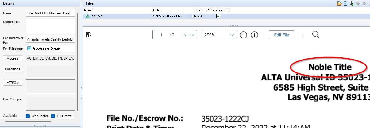 Note: If the Loan Amount on the Title Draft CD is the same or slightly higher than the Loan Amount in Encompass, you can update the fees. If the Loan Amount on the Title Draft CD is lower than the Loan Amount in Encompass, do NOT update the fees. Request an updated Title Draft CD from the branch.