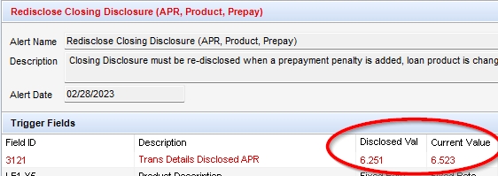 If there is a “Redisclose Closing Disclosure (APR, Product, Prepay)” alert, see if the APR went up by more than 0.125%. If it did, the Reason box “Change in APR” should be checked in “Closing Disclosure Page 1.” If the APR went down, you do not need to mark a box.