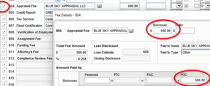 Appraisal Fee – Review the amount on the Invoice and whether it has been paid already. Open the Fee Details icon next to the Appraisal Fee in Encompass. The amount in Encompass/ALINA should either match or be higher than the amount on the Invoice (it should not be lower). Make sure the (POC) Paid Outside of Closing amount matches the amount already paid.
