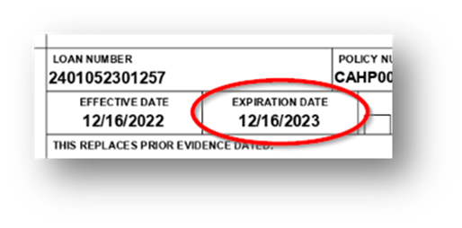 Hazard Insurance - This date should reflect the date after the Expiration Date on the Homeowner’s Insurance Policy Example: