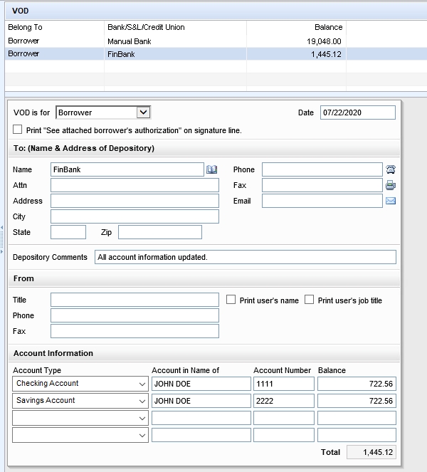 It is important to note that if the user has any additional assets that they want to add manually, they should be creating a new VOD record for the financial institution instead of appending the account to the VOD record that was inserted by the Finicity integration. If the user modifies the record created by the Finicity integration and requests a “Refresh” later on, the manually entered in information will be overwritten. If there are any issues when Finicity is retrieving the updated account information the “Depository Comments” will be updated to include a message about the issue.