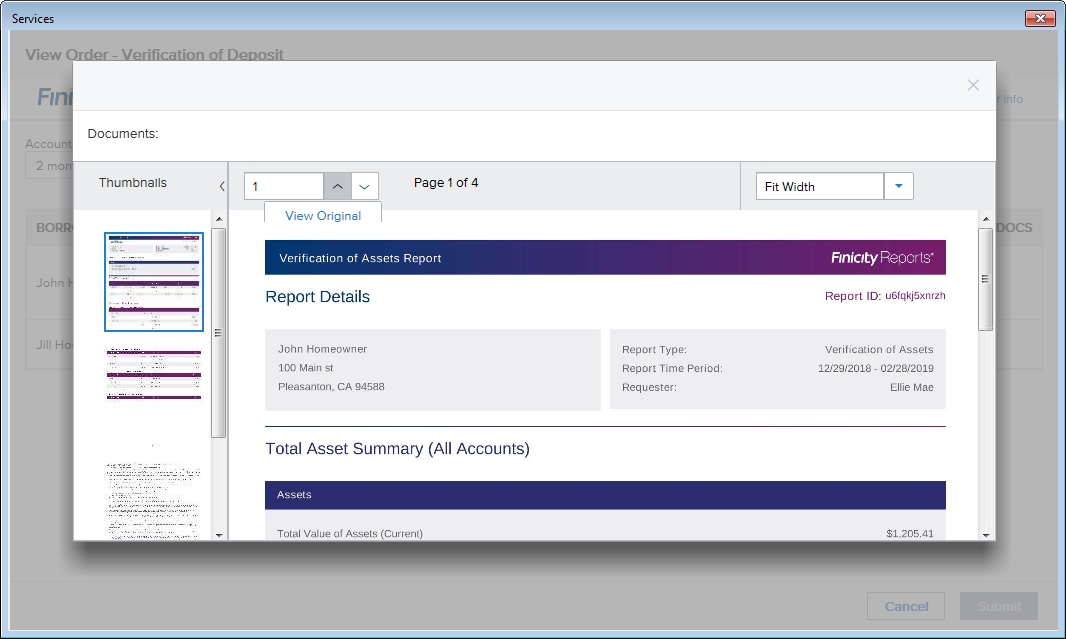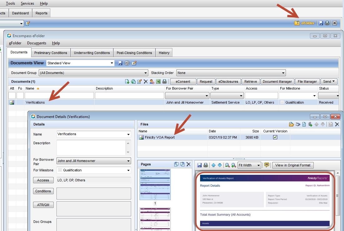 A completed VOA report can be viewed by clicking on the document icon on the Order UI or by visiting the Encompass eFolder and opening the VOA Report document to view the latest report.