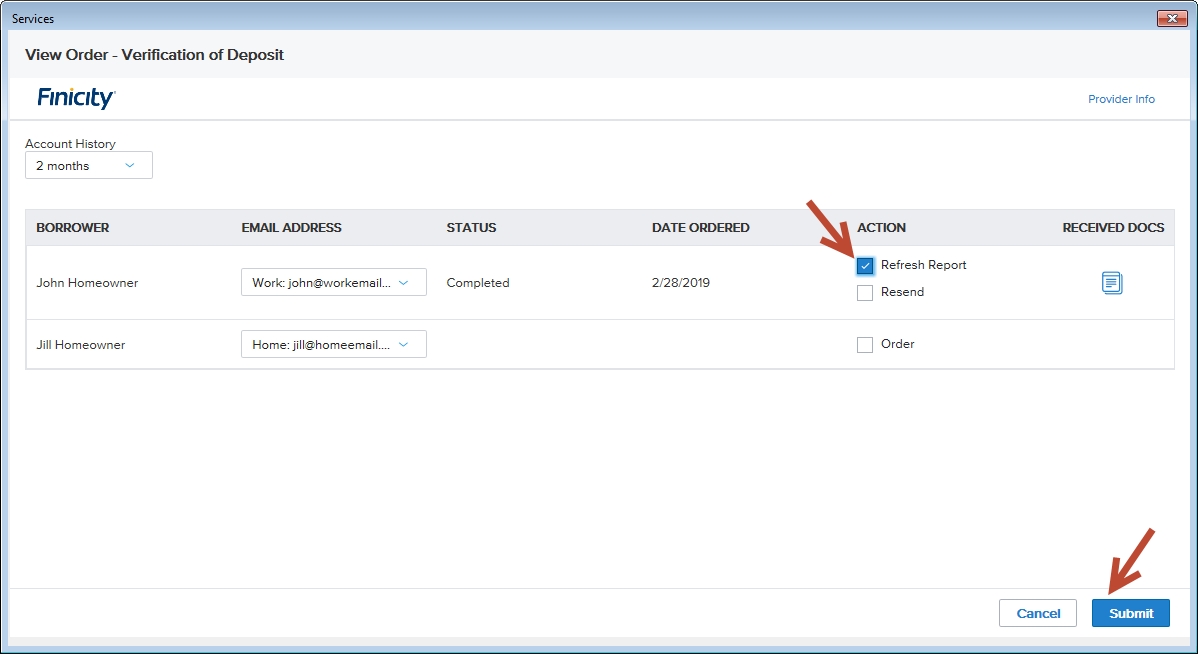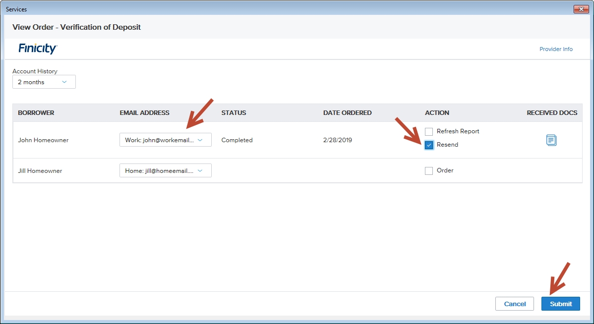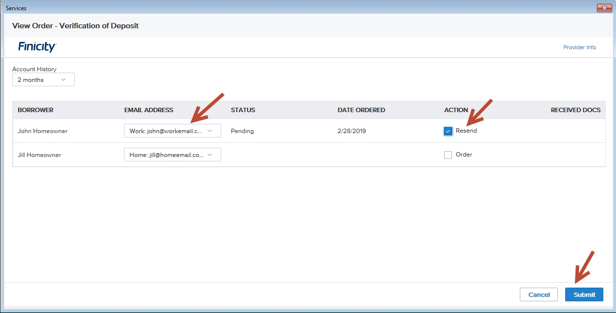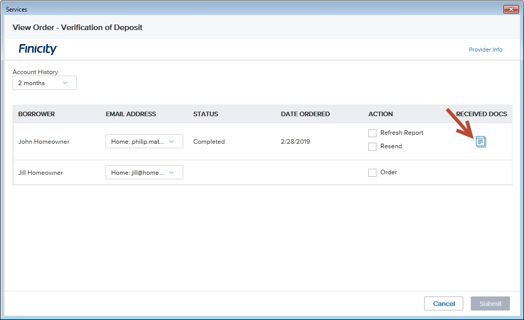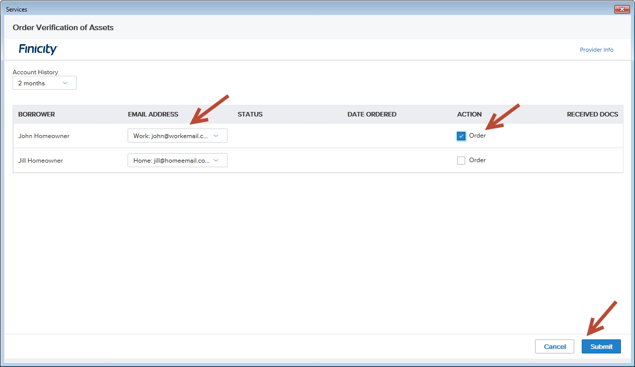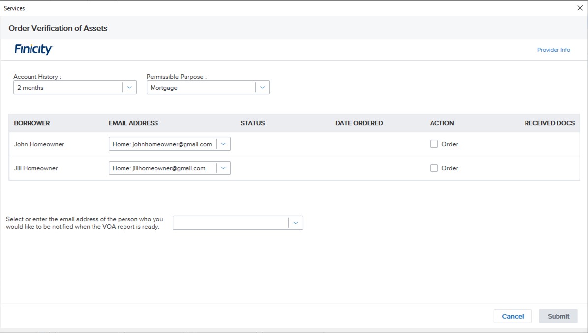 To submit a VOA request for a specific borrower, in the Email Address drop down select the email address where the borrower can receive an email notification from Finicity. Then check the Order checkbox and click on the Submit button. Note: You can change the Account History from the default 2 months to 6 months by selecting that from the Account History drop down.