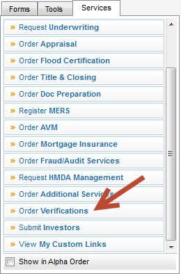 To submit a VOA request for a borrower through Encompass, first open the loan file, click on the Services tab on the lower left and then click on Order Verifications.