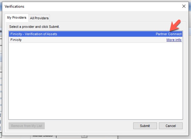 From the My Providers list, select Finicity – Verification of Assets and click Submit. If Finicity – Verification of Assets is not listed in the My Providers list, check in LO Connect to ensure that the user was given access to the Finicity – Verification of Assets service.