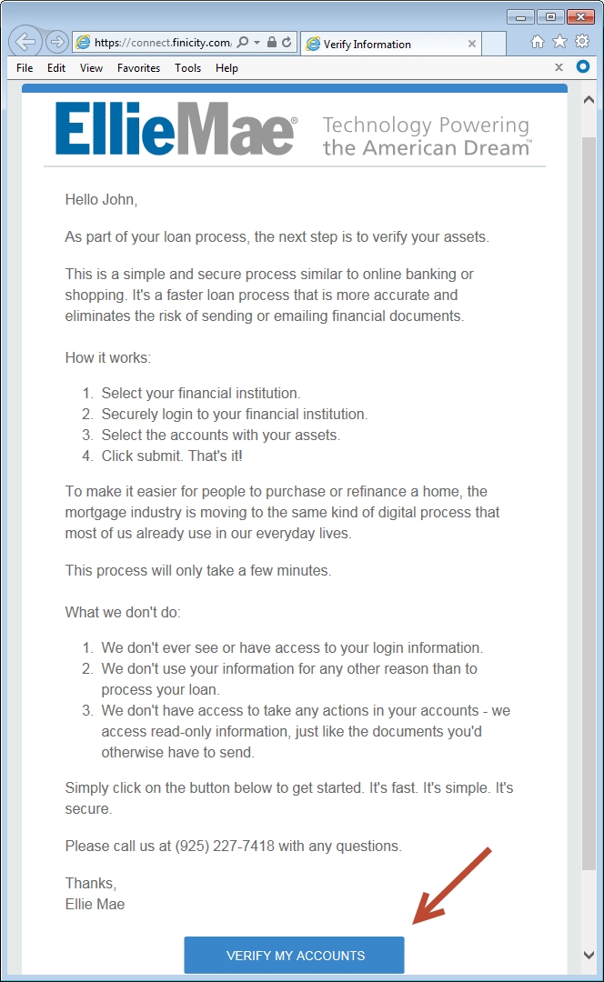 The borrower will receive an email containing instructions on how Finicity retrieves the financial records of the borrower along with a “VERIFY MY ACCOUNTS” link at the bottom of the email which the borrower can click to take them to the Finicity Connect portal to proceed with their asset verification.