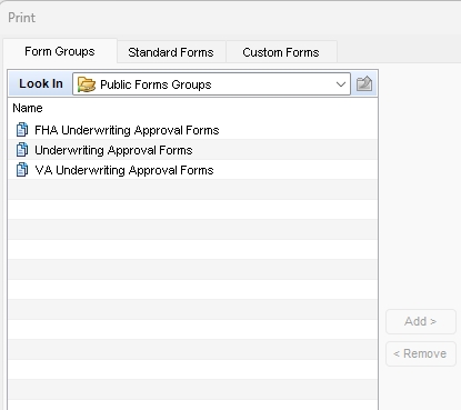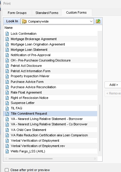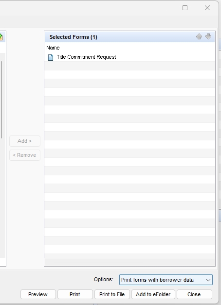 You will see “Title commitment Request” switch over to the Selected forms side of the Print screen.