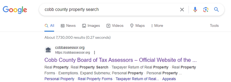 After you have identified the subject property’s county, search online for the county’s Tax Assessors Office property directory. Each county’s Tax Assessors Office website is very different, so become familiar with as many county websites as possible, starting with the counties and states you most commonly work with. Some county websites are more difficult to navigate than others.