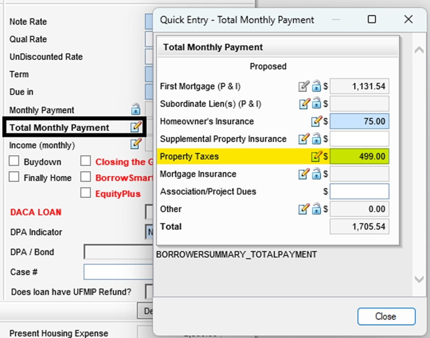 Go to Forms > Borrower Summary || Enhanced, scroll down to the Transaction Details section, locate the Total Monthly Payment line, and click the Edit icon to open the Total Monthly Payment window. Add the monthly property taxes amount to the Property Taxes line.