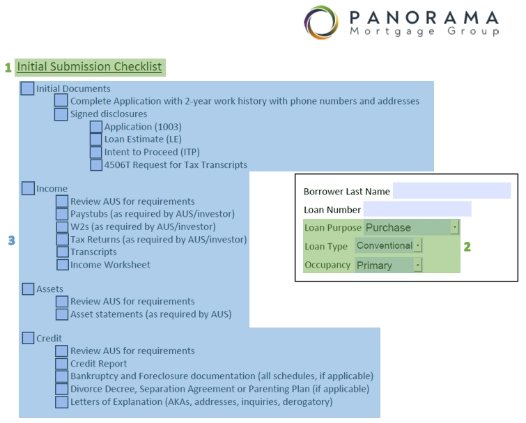 Processors and Loan Officers use checklists to track the documents that need to be submitted for underwriting. These checklists are based on the program requirements and, while their general structure will always be the same, different lenders and programs use different templates.