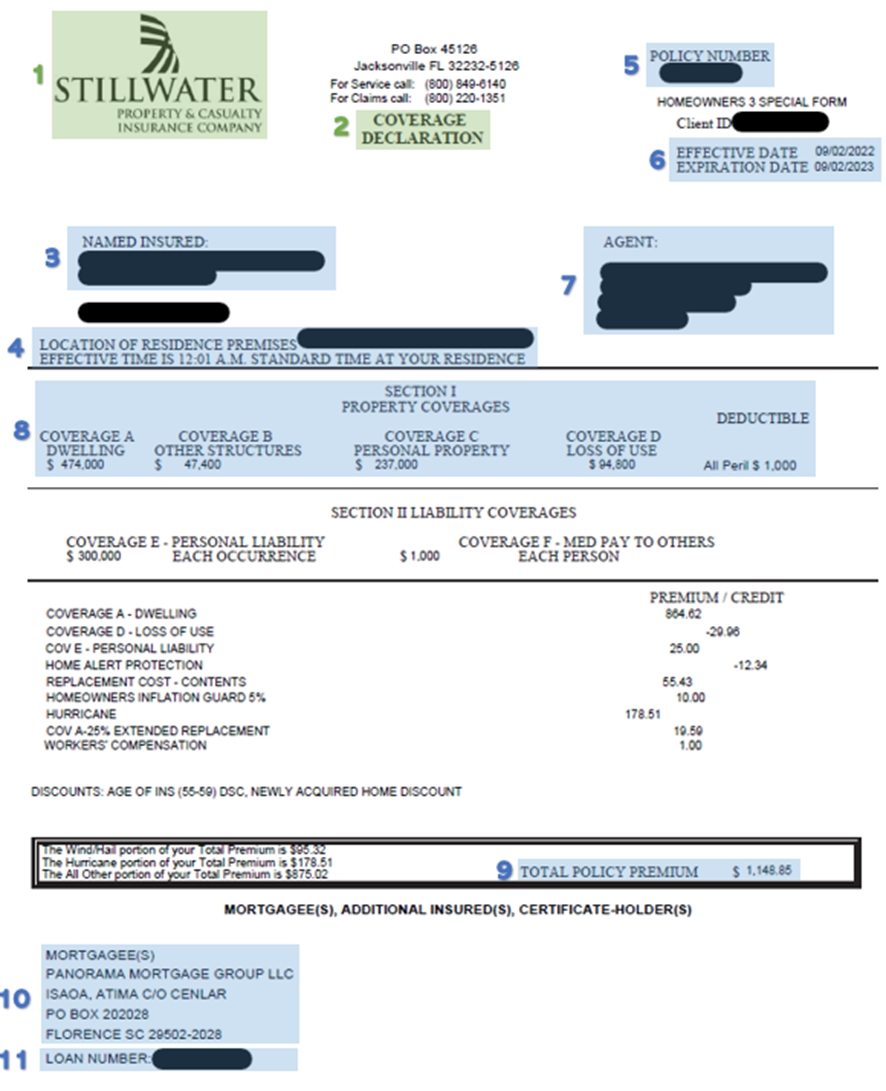 Document title with insurance verbiage: coverage declaration, declarations page, hazard insurance, homeowner’s insurance, policy page, insurance binder, certificate of insurance, etc.