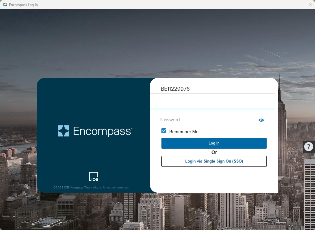When the Encompass Log In window opens, make sure the instance ID is correct. ALINA has instance ID BE11229976. You do not need to type your username or password to log in. Use Login via Single Sign On (SSO) to access Encompass.