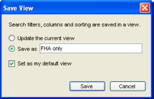After changing the columns, sorting the data, applying search criteria, selecting specific loan folders to use, or selecting All Loans or My Loans (where applicable), you can save the new configuration as a new custom view. Once you save a view, you can select it at any time to apply the criteria to your loan or contact data.