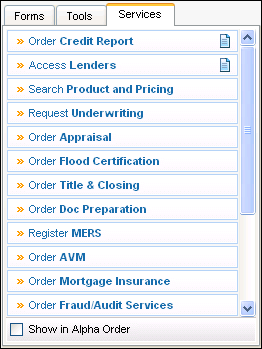 The ICE Mortgage Technology Partner Network connects Encompass to online service lenders and service providers. When you place orders through the ICE Mortgage Technology Partner Network, a record of the transaction is created in the Log. You can order services from the Services tab and certain loan forms.