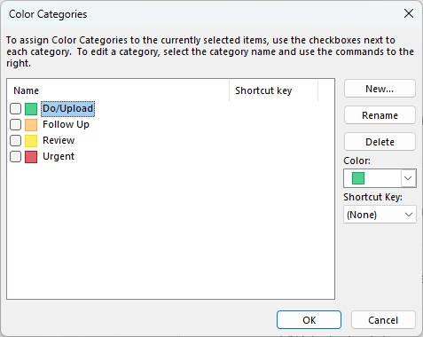 You can click on Categorize and All Categories to open the Color Categories window. In this window, you can manage your current labels, add shortcut keys to them, create new labels with custom colors, and delete labels.