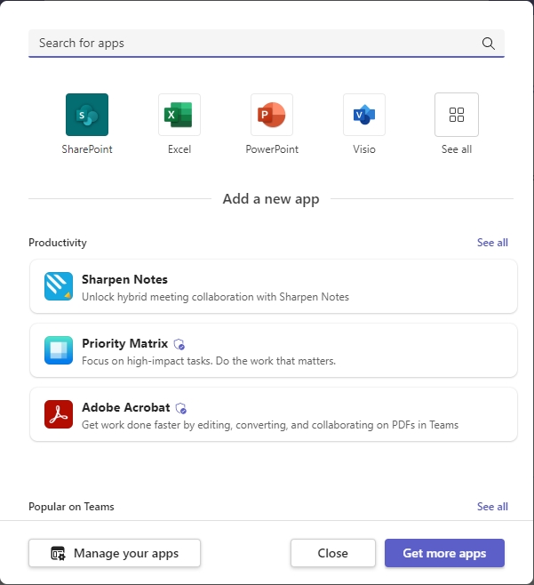 You will have a list of top apps categorized into Productivity, Popular on Teams, Streamline projects, Best selling, and Education, but those are not all apps that can be added to a team channel.